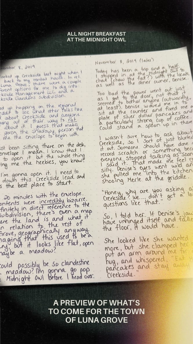 She'd been there less than 24 hours when a person, whose identity could not reasonably be discerned, handed over an envelope with strange information about something called "Creekside". It's worth noting that this person had gloves on when they handed over the envelope. Liv made note of it in her journal.